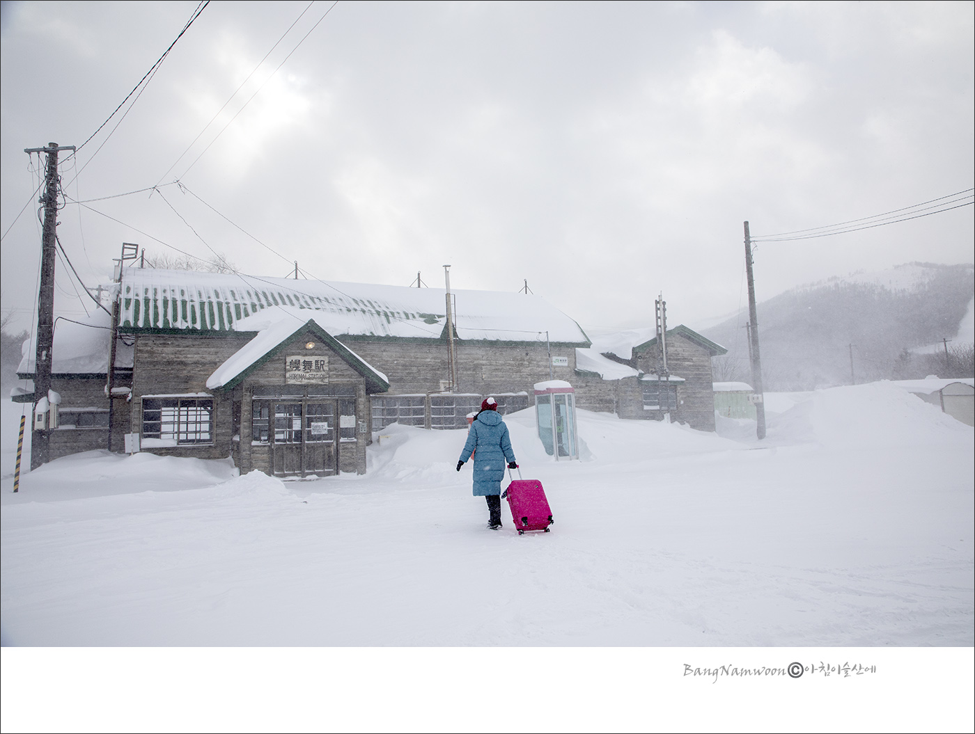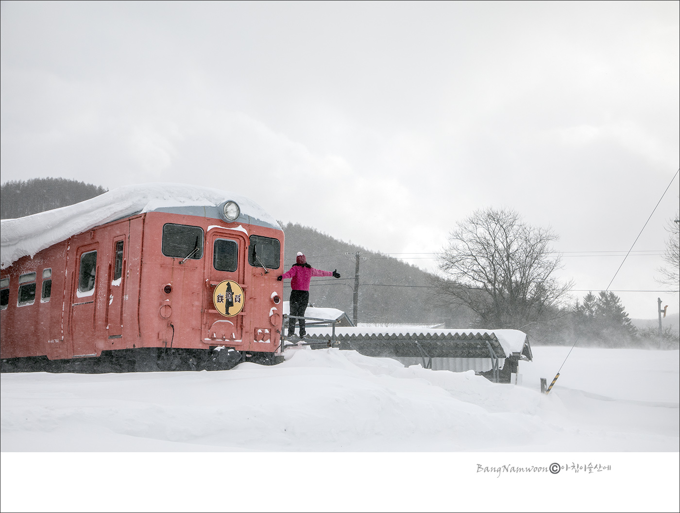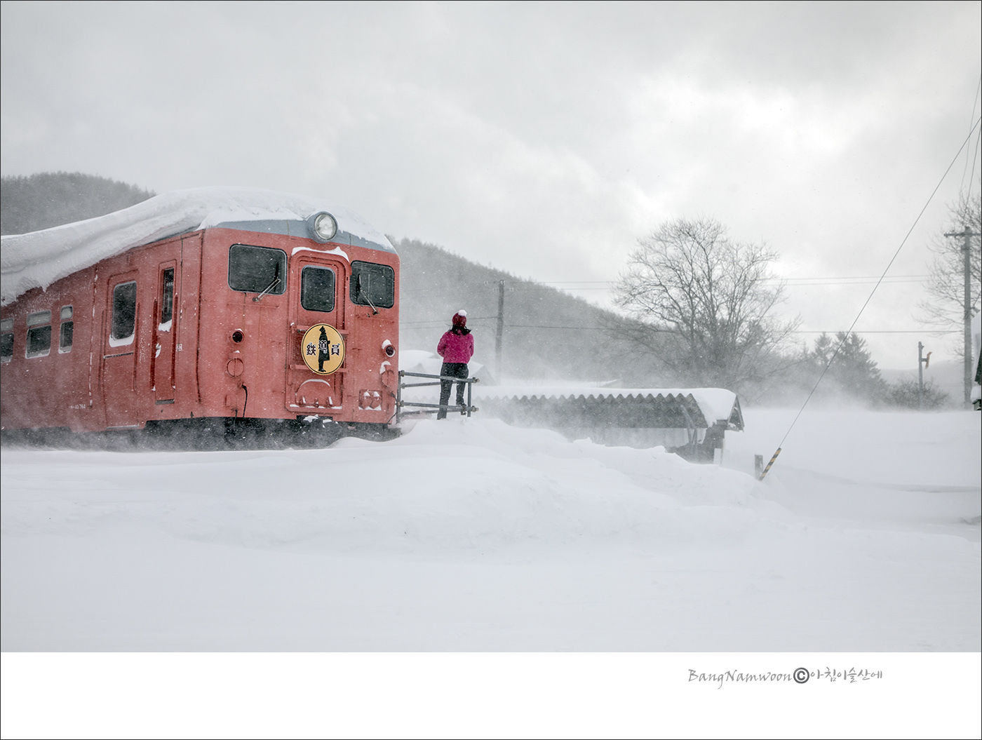 일행 중 모델급 회원이 영화처럼.... 잠시 연출을 해 주어 눈보라치는 황량한 시골역에 그림 같은 풍경을 만들었다... 감사