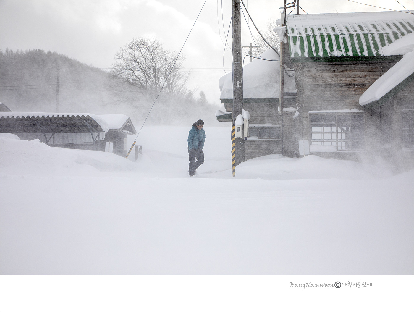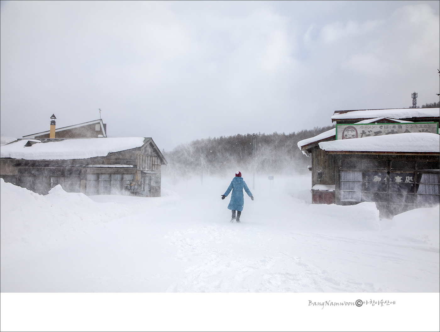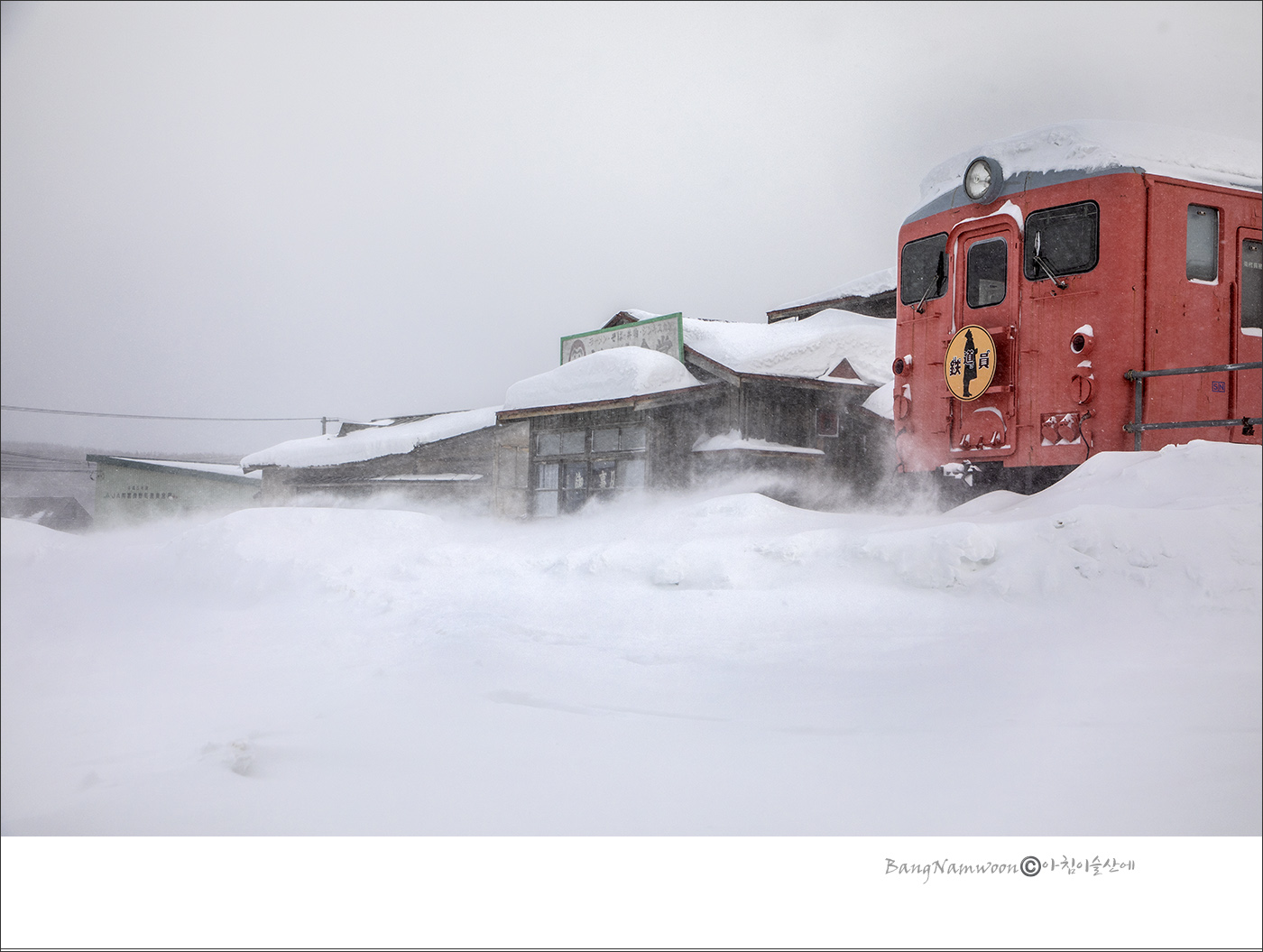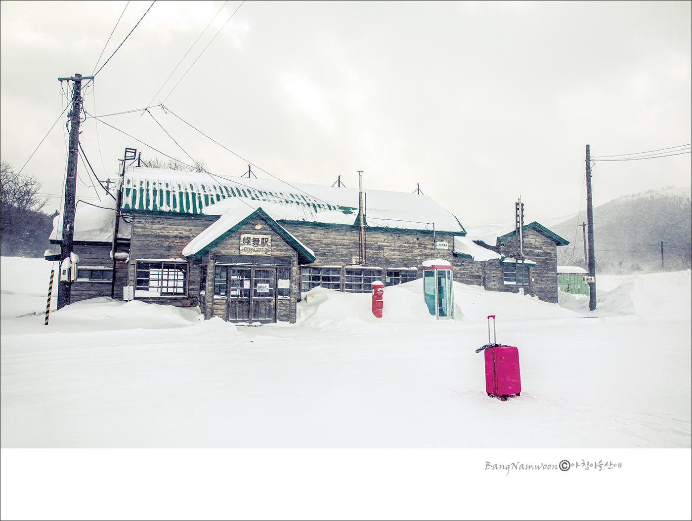 일행 중 모델급 회원이 영화처럼.... 잠시 연출을 해 주어 눈보라치는 황량한 시골역에 그림 같은 풍경을 만들었다... 감사