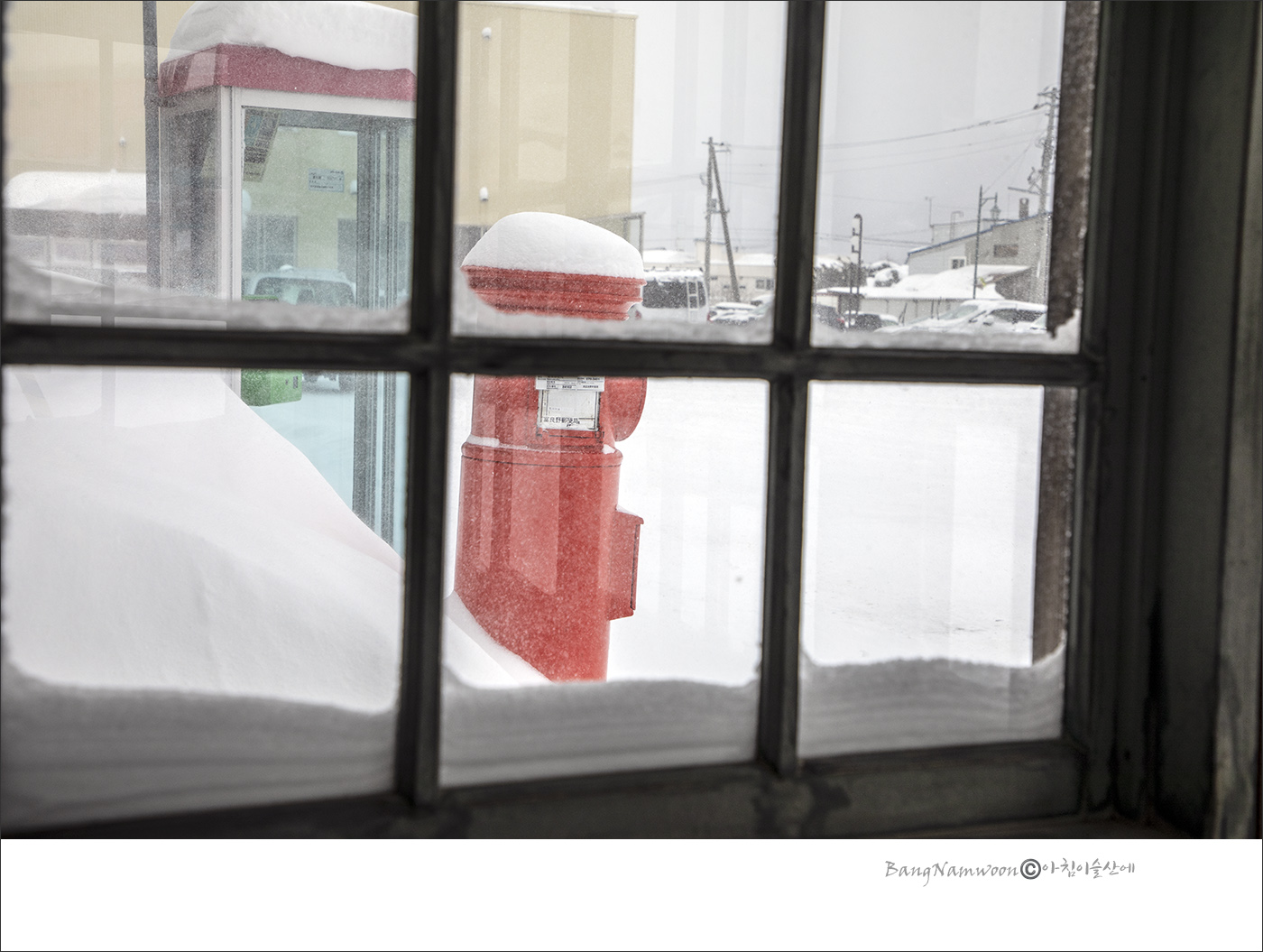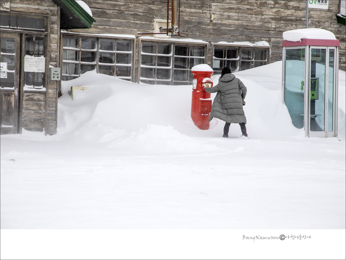 驛앞에 우리네는 이제 보기 힘든 눈 쌓인 빨강 우체통에 실제로 우편물을 넣고 있는 현지인 모습이다. 그 옆에는 동전 넣고 통화하는 공중전화 부스도 있네.... 아직도